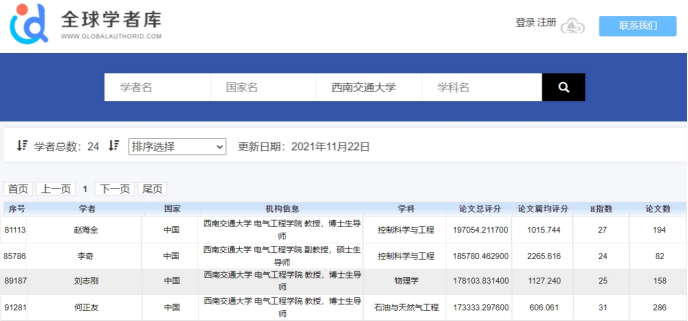 Recently, the website of Globalauthorid listed the "Top 100,000 scientists in the world". According to the statistics, 87 people were selected from the College of Electrical Engineering of universities in China. Among them, four professors from the School of Electrical Engineering were selected, namely Prof. Zhao Hai-quan, Prof. Li Qi, Prof. Liu Zhi-gang and Prof. He Zheng-you.